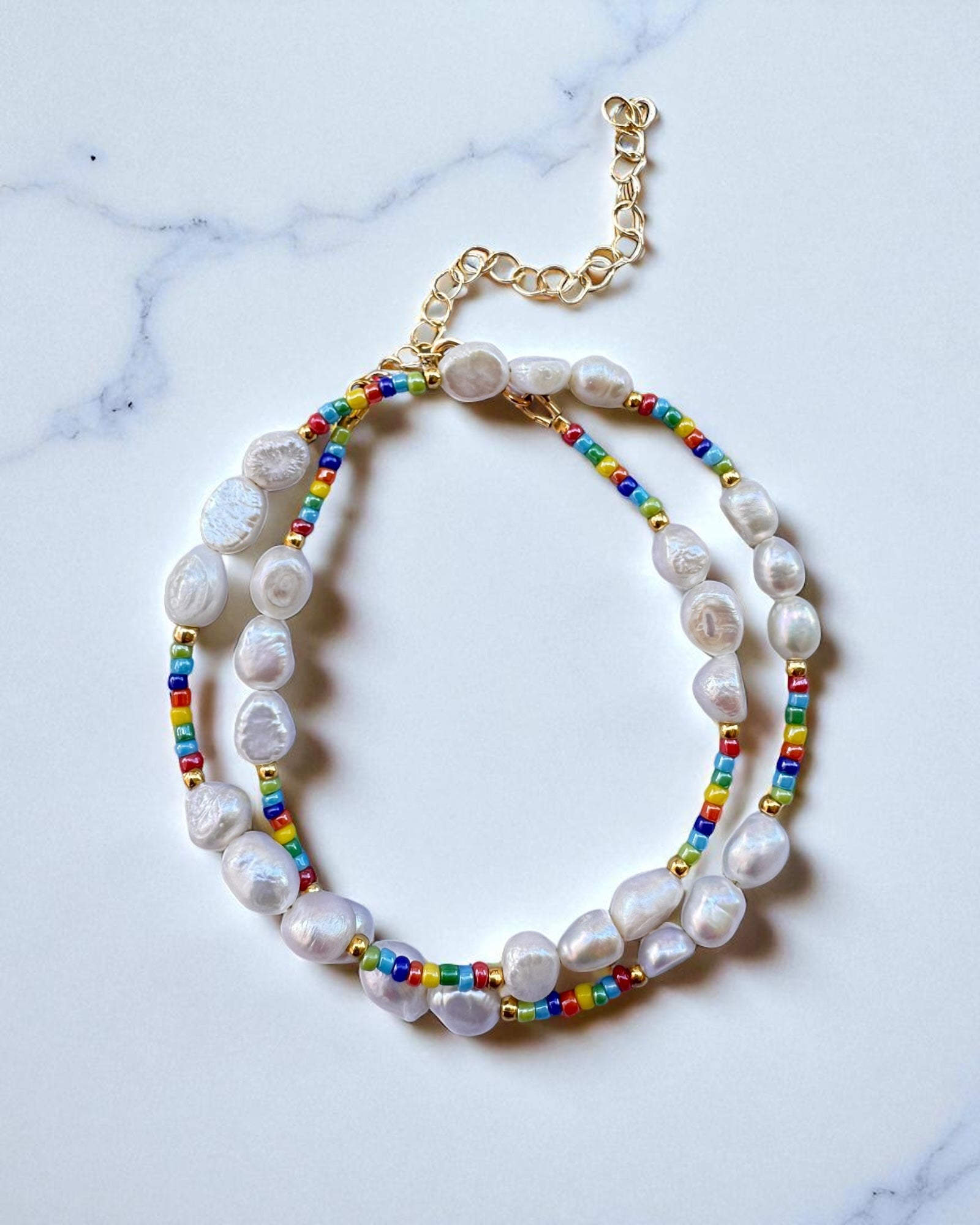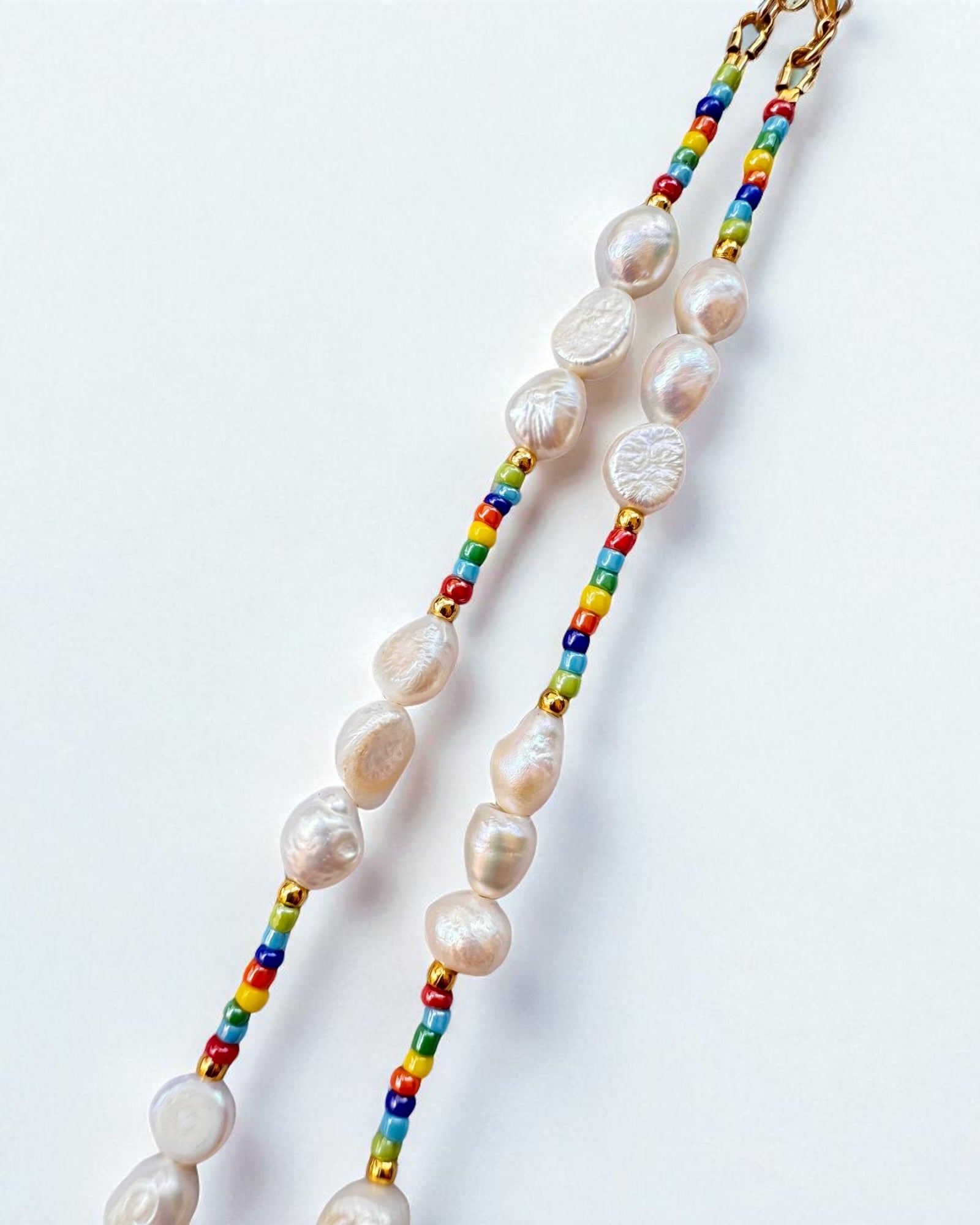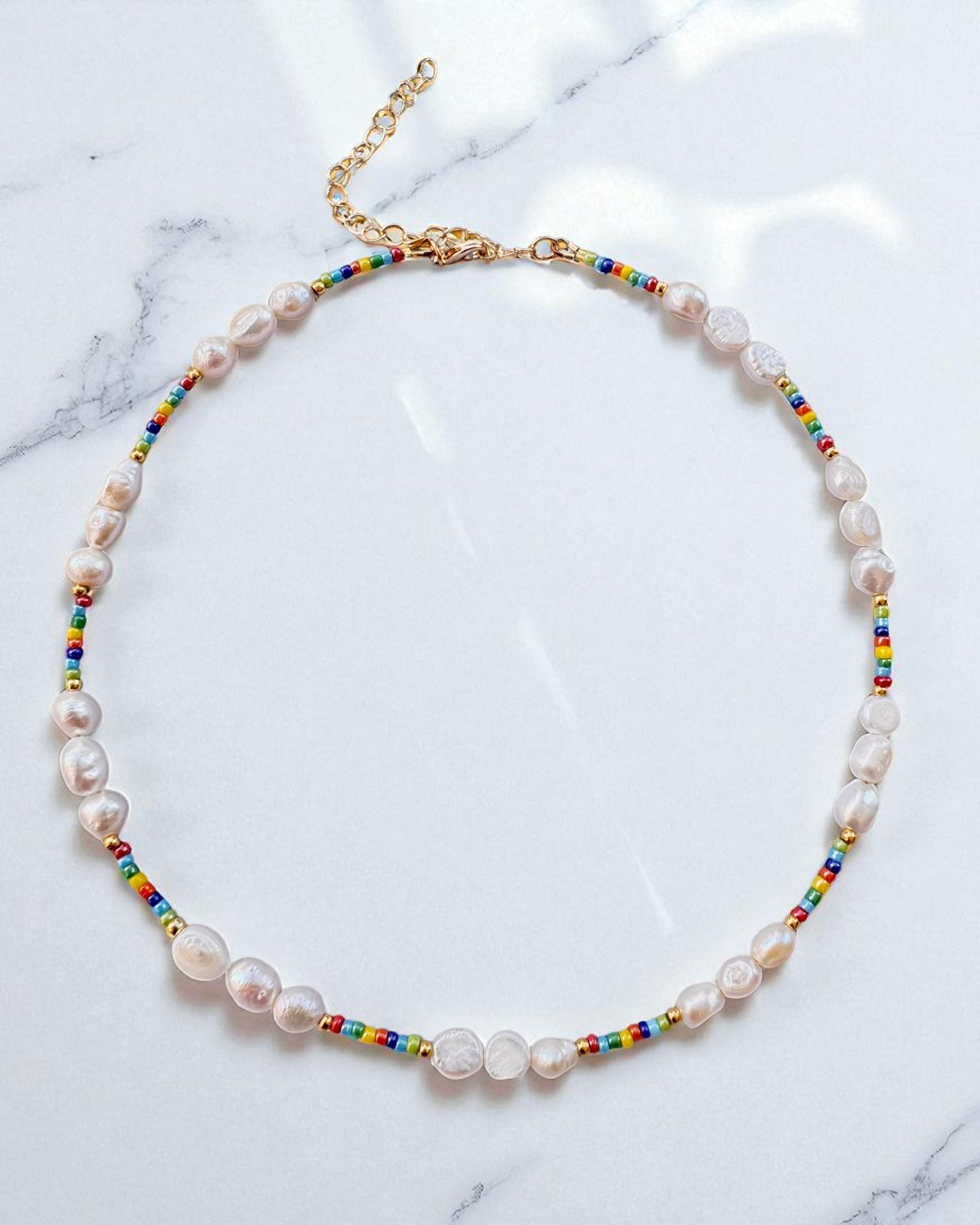 Handcrafted with love, this stunning necklace combines the natural beauty of lustrous freshwater pearls with a vibrant pop of color from glossy rainbow seed beads. All golden accents, including the clasp and extender, are 24K gold plated over durable stainless steel, ensuring lasting shine and quality. The necklace measures 41 cm (approximately 16.1 inches) in length, with an additional 7 cm (approximately 2.8 inches) extender chain for adjustable wear. A unique and cheerful addition to any jewelry collection.